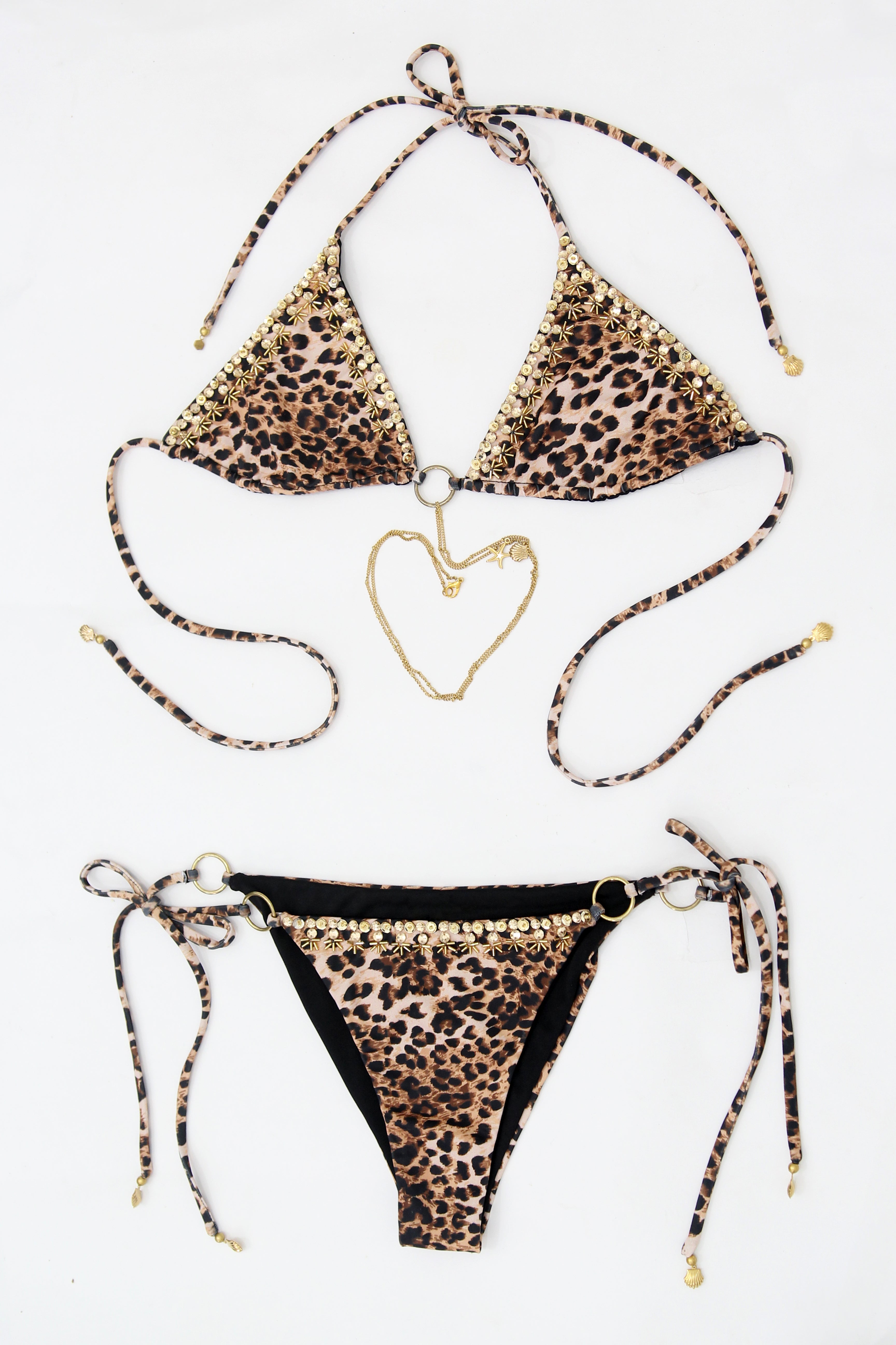 A bold leopard print bikini with standout golden accents. The top and tie-side bottom are adorned with gold shell and stars charms trim, and the look is completed with a delicate gold body chain .