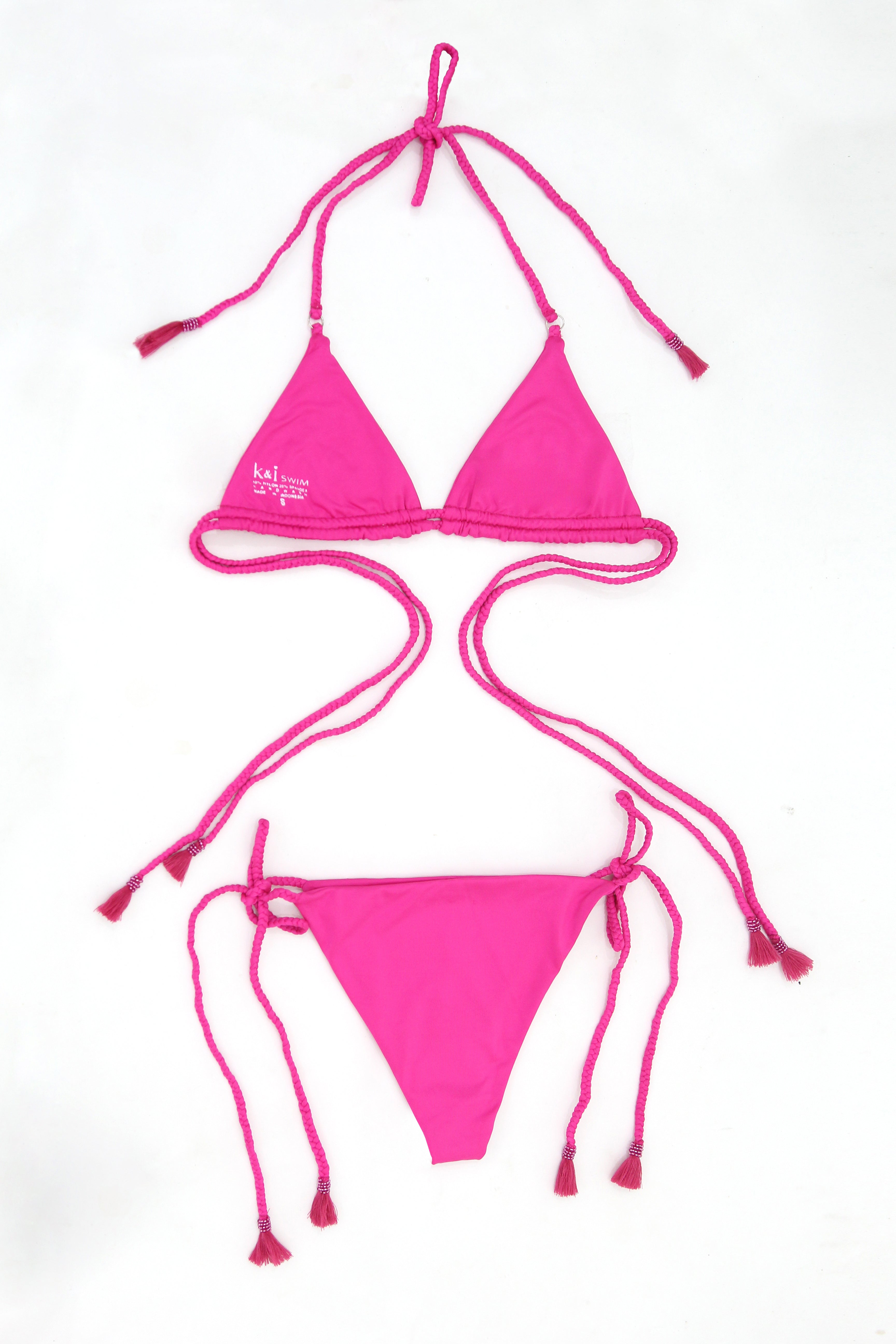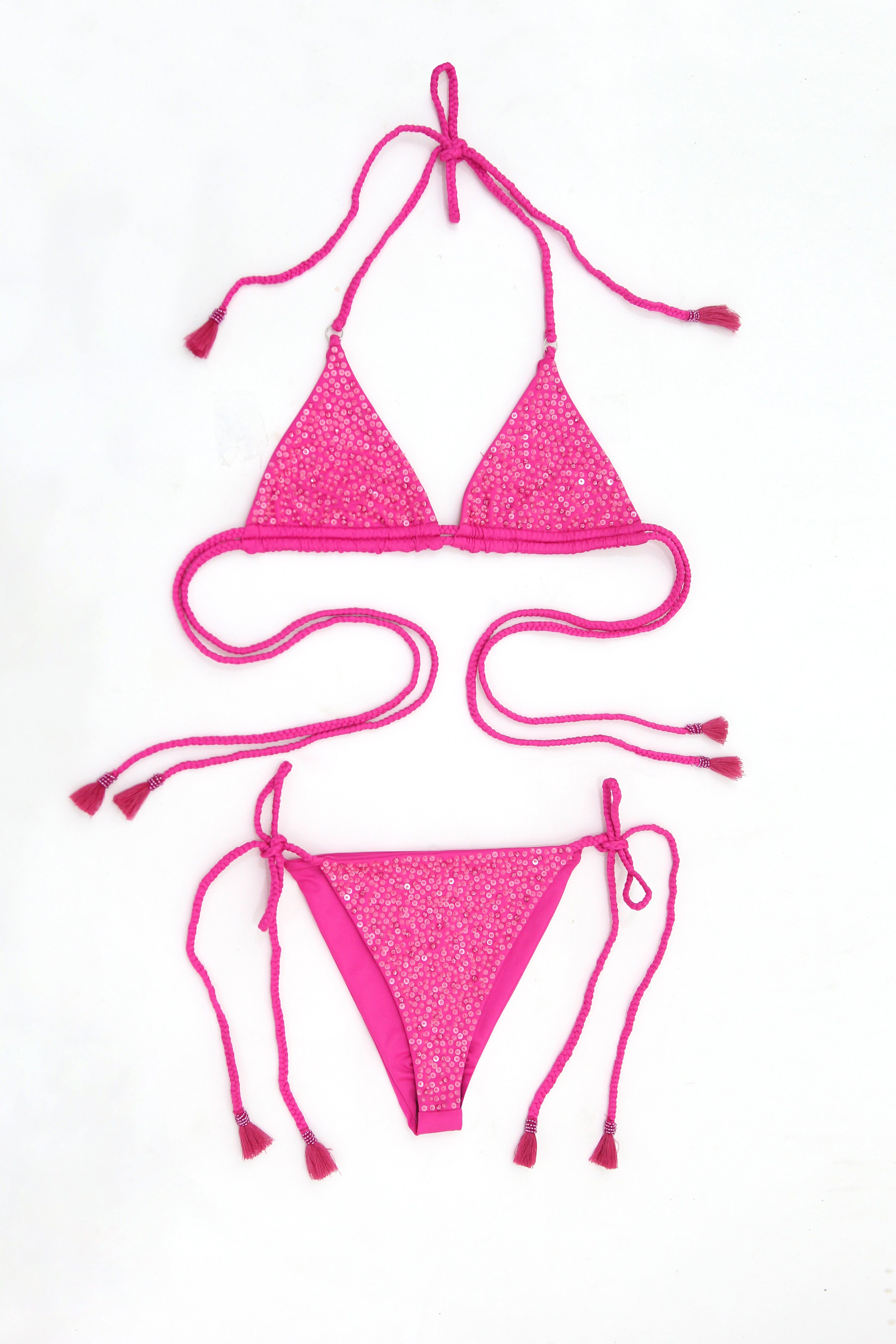 A high-energy hot pink triangle bikini fully covered in micro-sequin embellishments for ultimate sparkle. The adjustable plated ties feature playful tassel details.