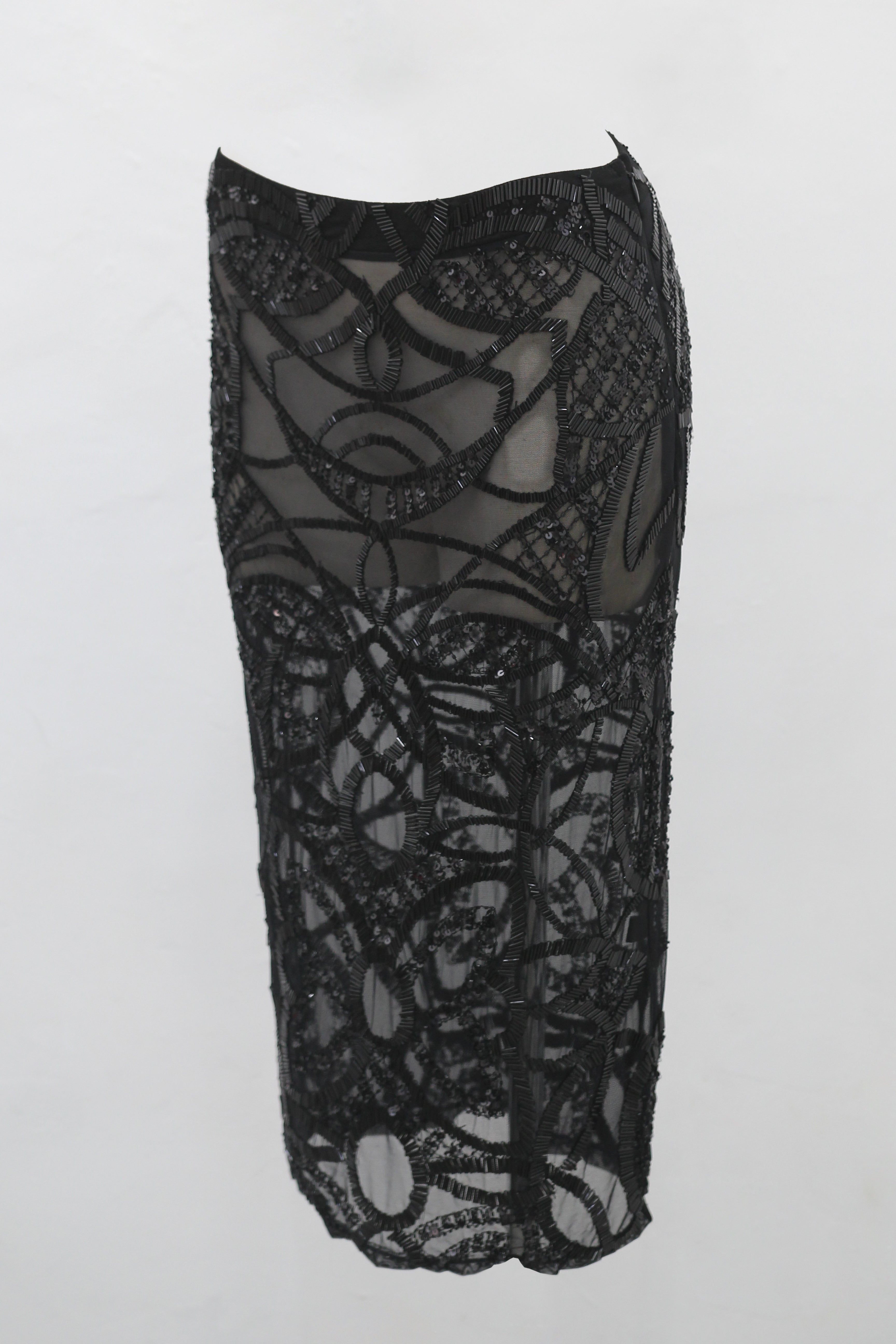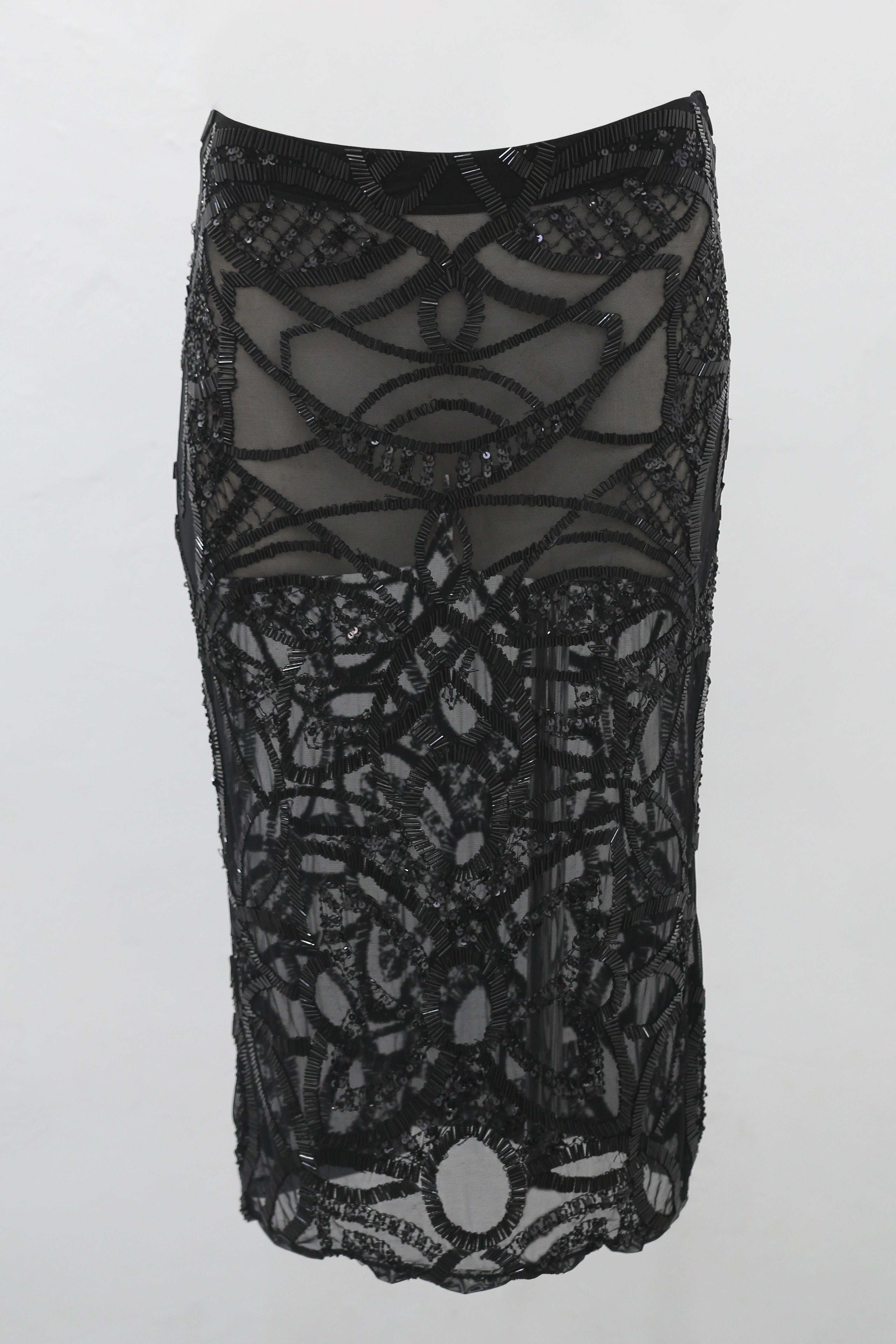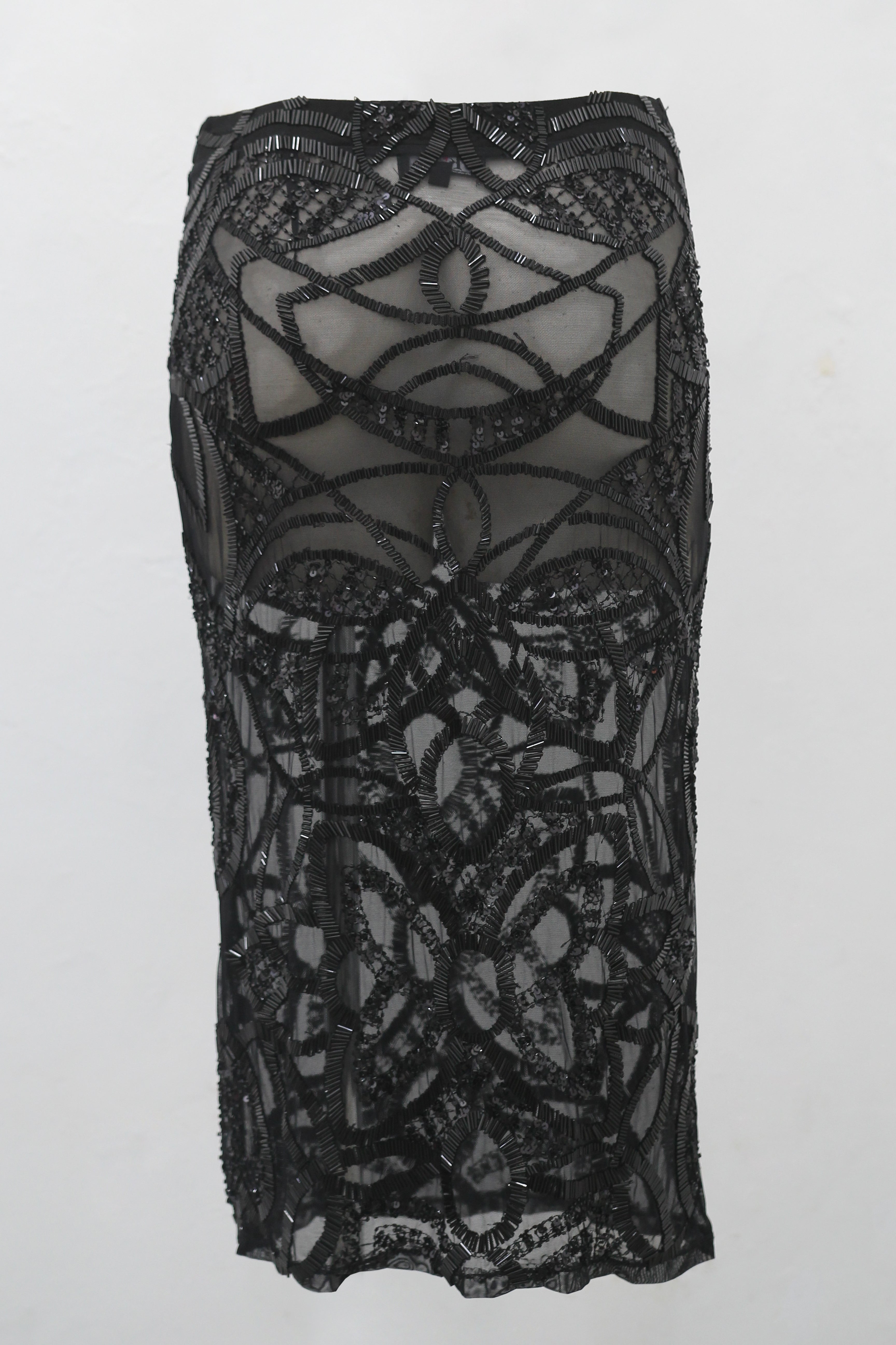 A stunning medium lenght skirt with a sheer overlay, hand beaded with an intricate geometric black pattern.