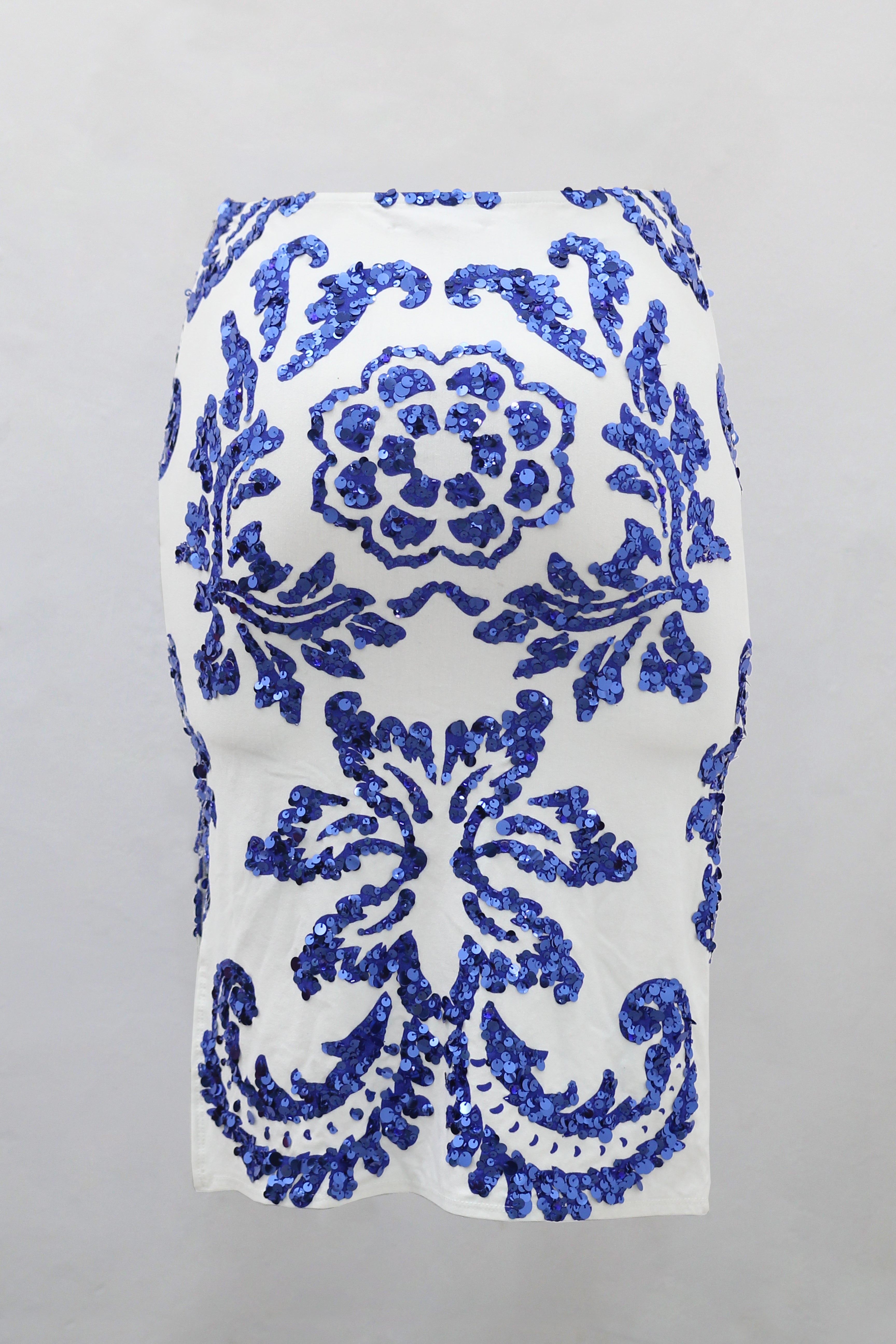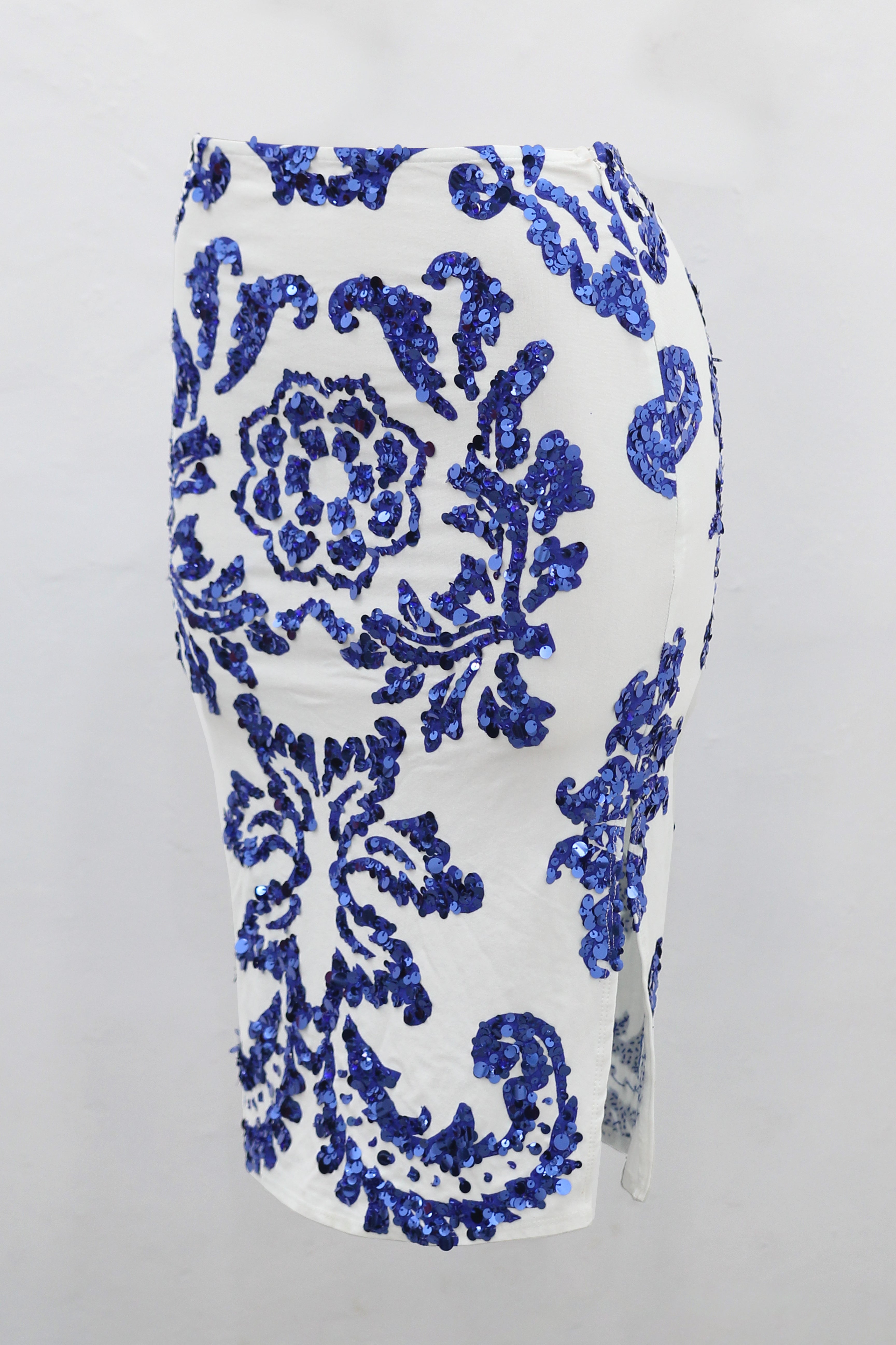 A sleek, form-fitting midi skirt featuring a high side-slit and a vibrant royal blue baroque-style print with sequin detailing.