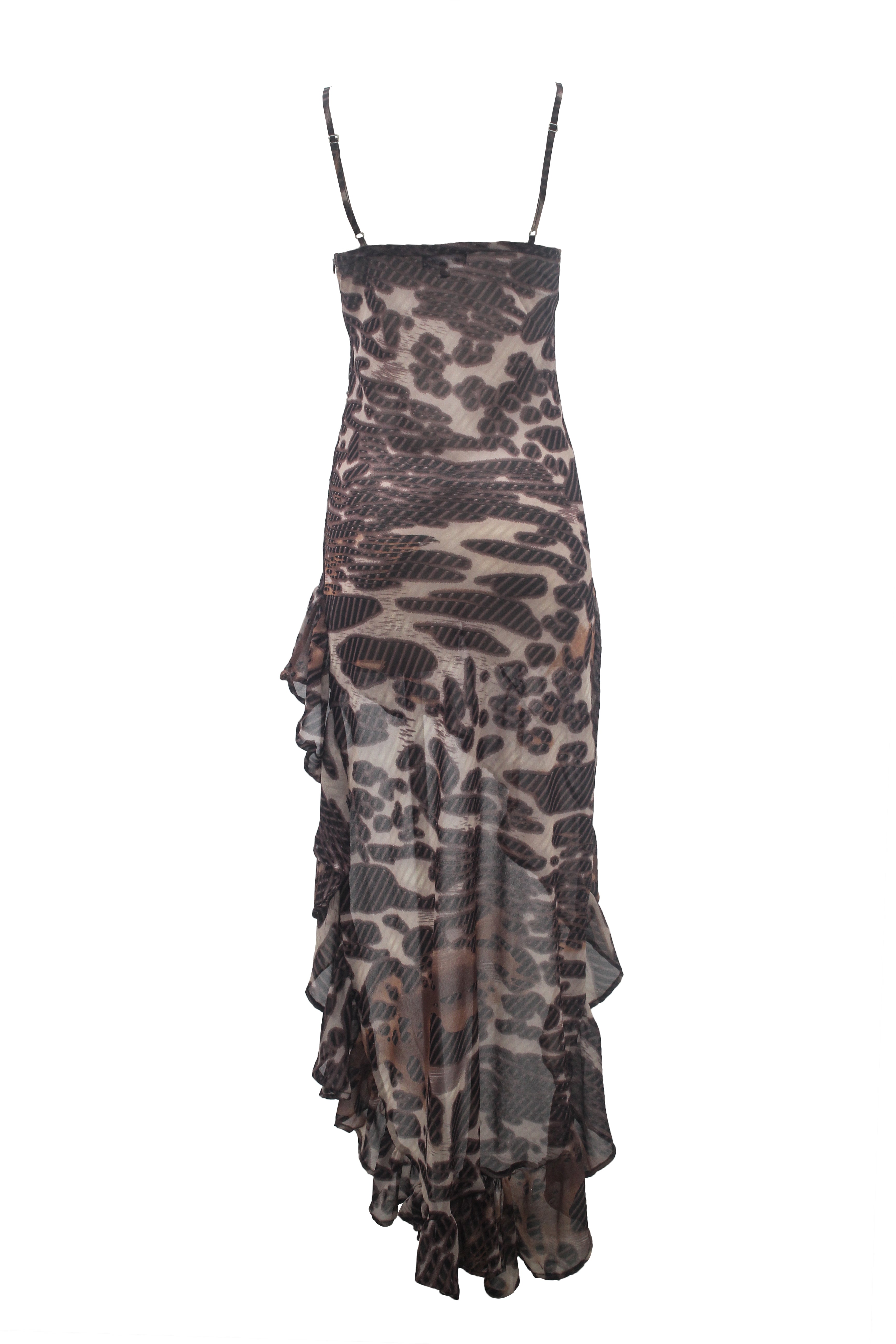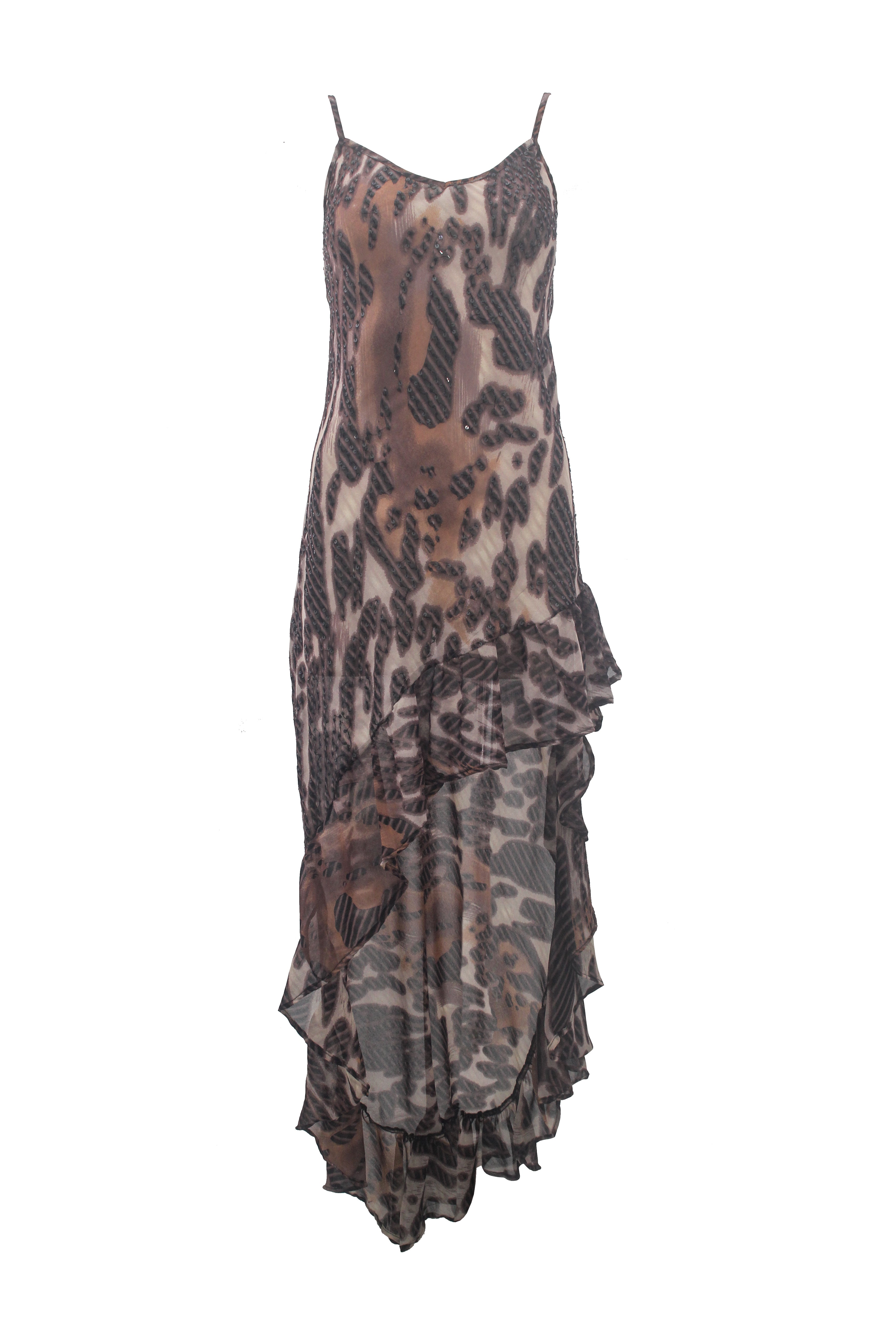 Effortless flowing slip dress, featuring a wild mix of animal and paisley prints. Accentuated with delicate gold beading and an asymmetrical ruffle hem, it’s the perfect blend of bold and feminine for sun-kissed days and balmy nights.