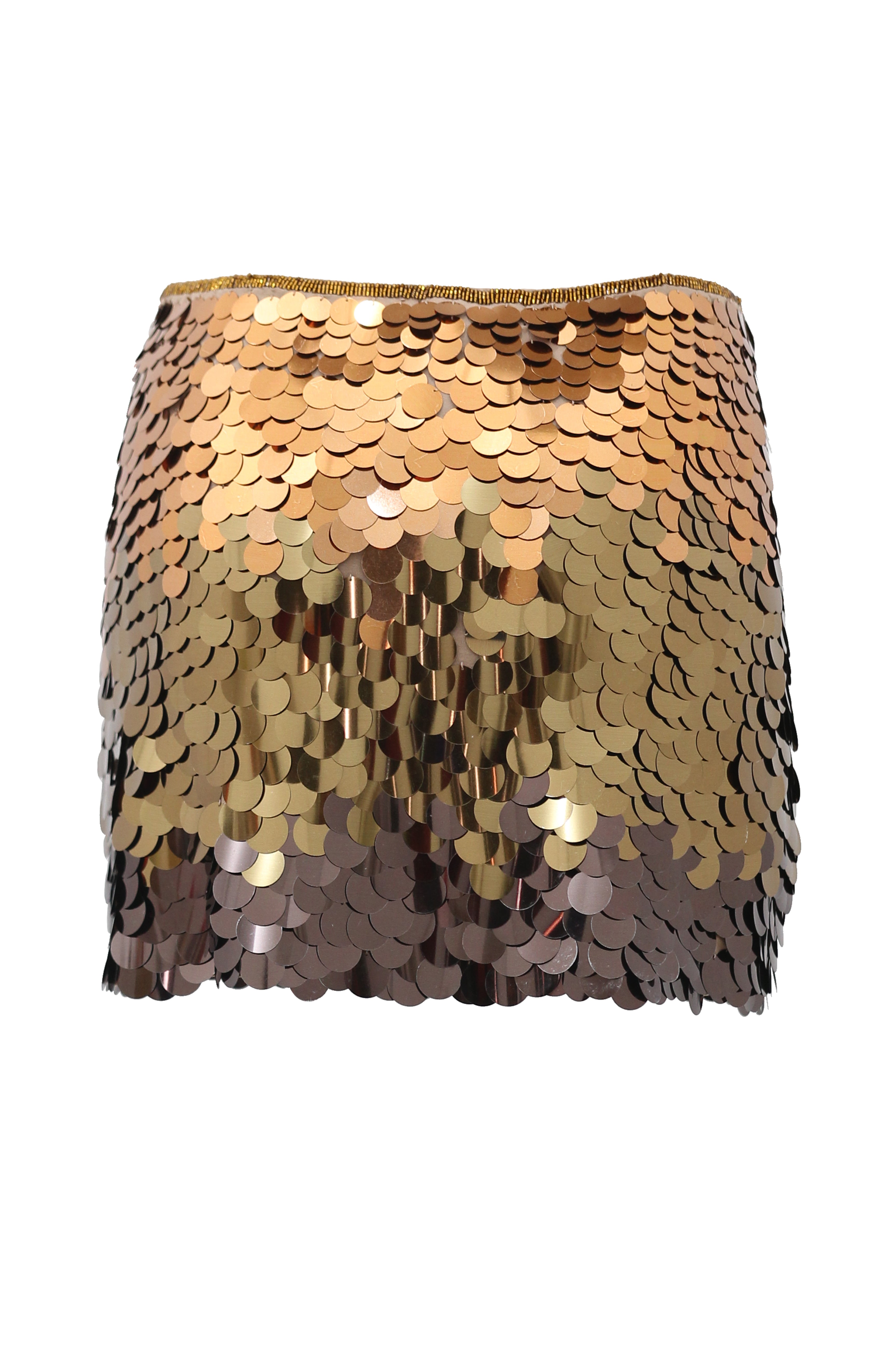 Entirely hand beaded with sequins in shades of gold and bronze.