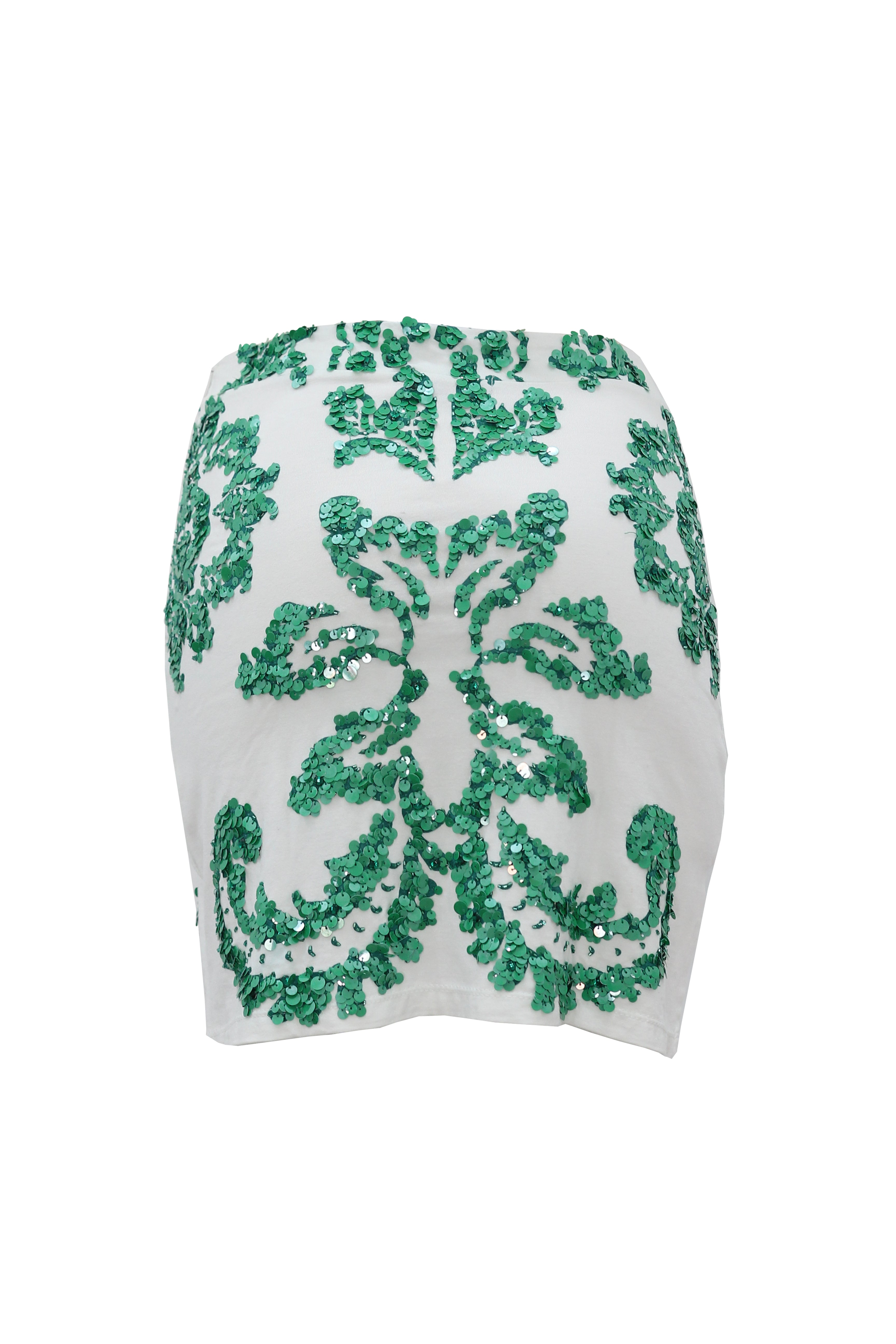 A form-fitting mini skirt with an all-over matching green sequin pattern, ideal for warm-weather daytime events.