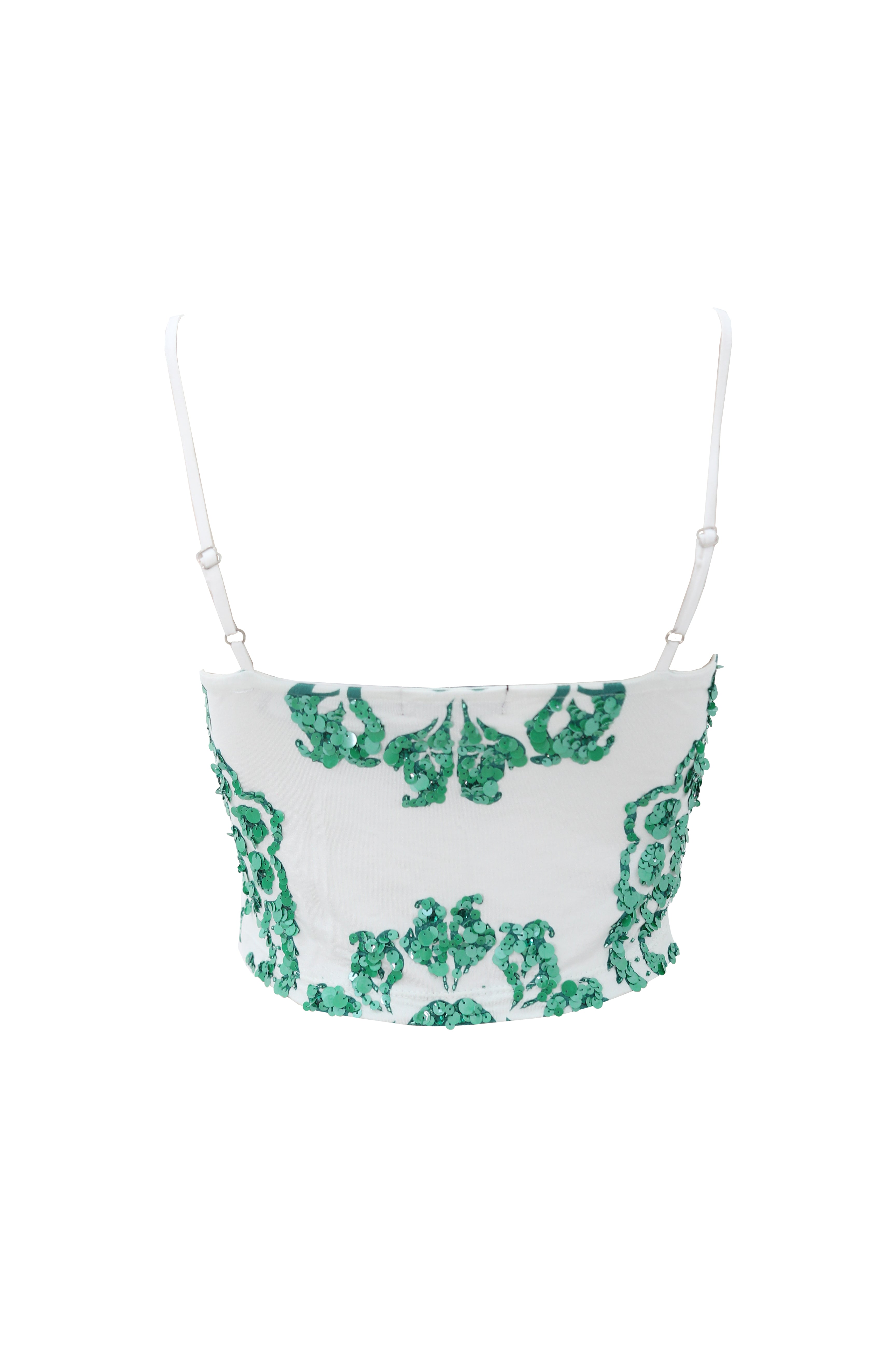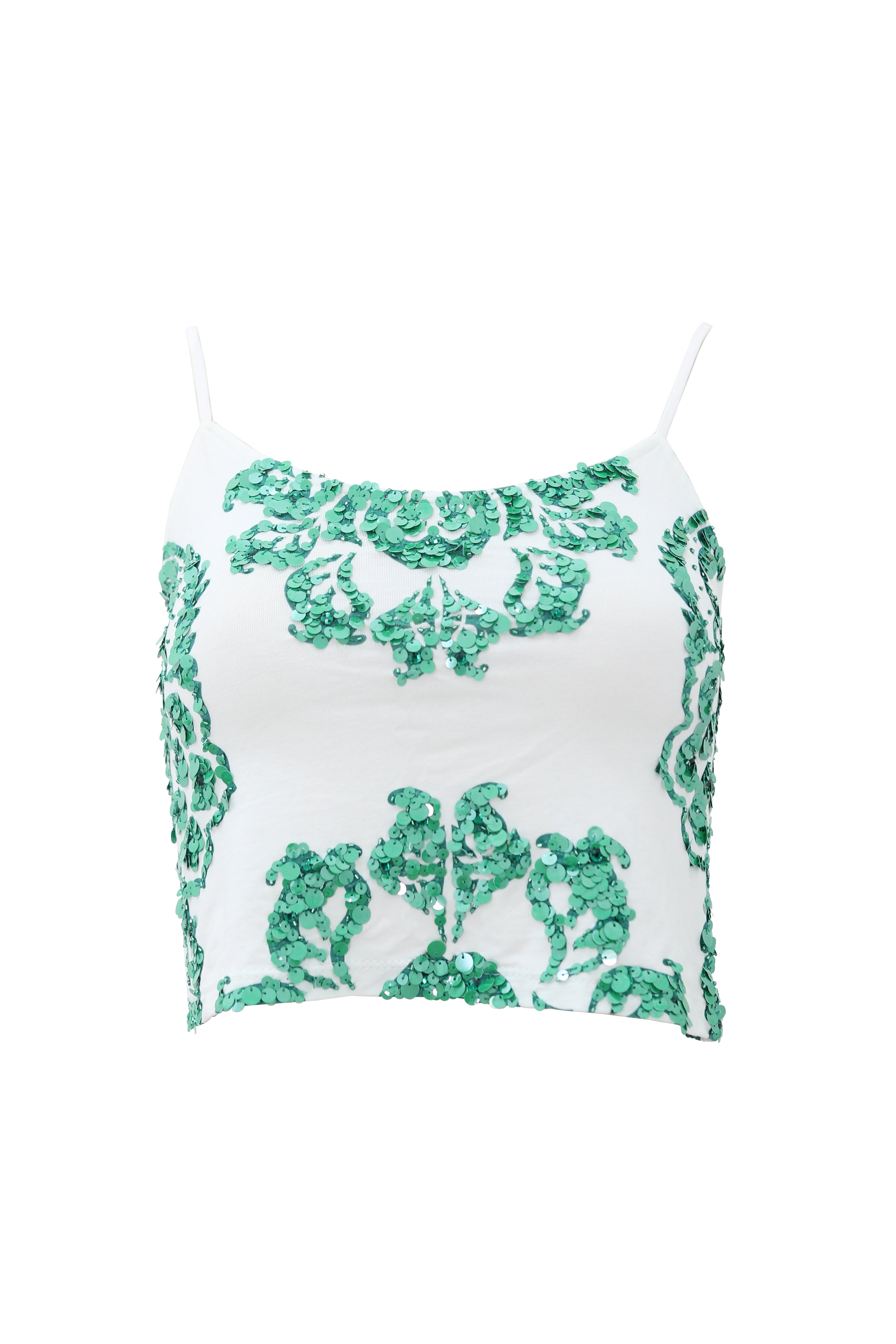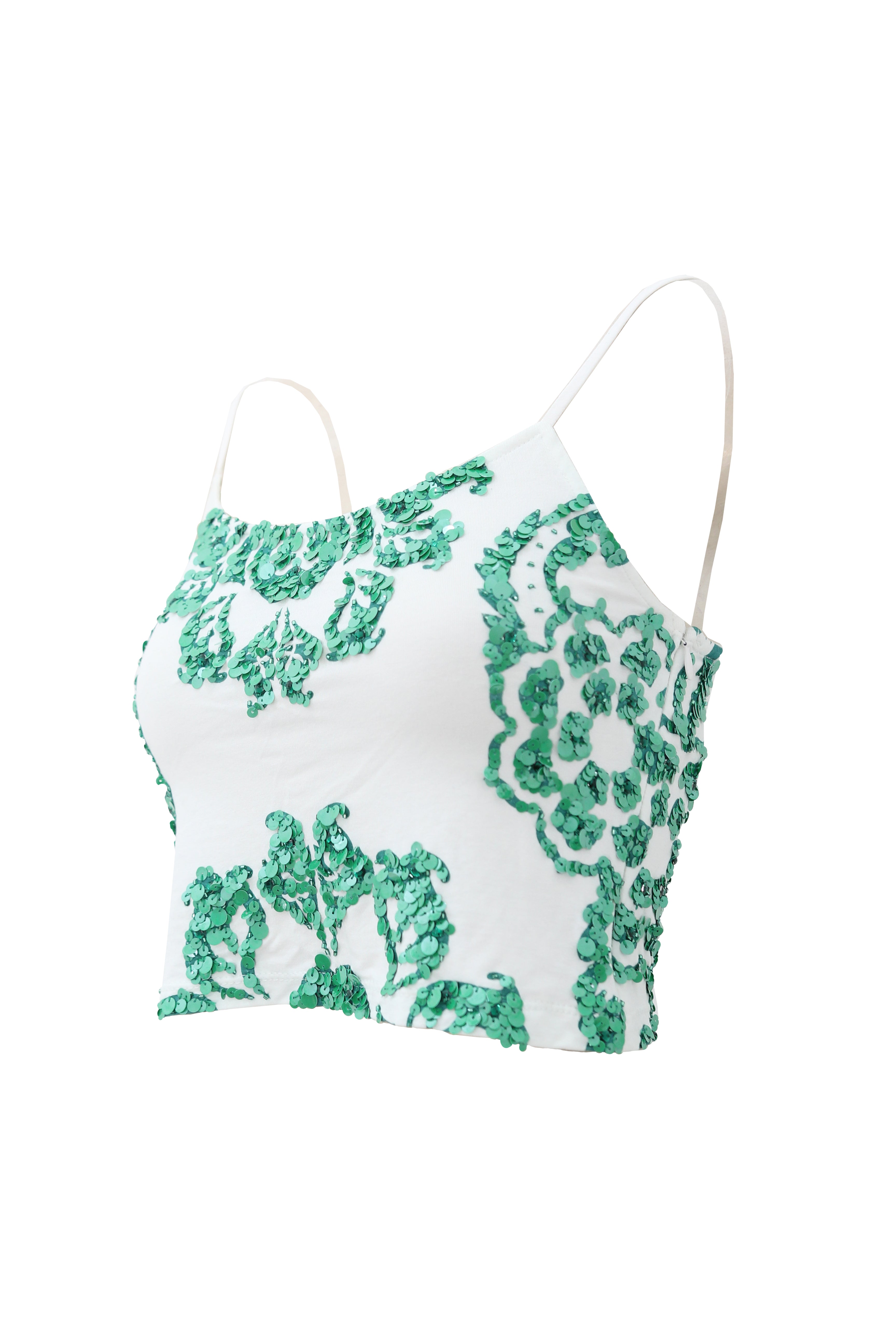 A stunning white top featuring a vibrant emerald green baroque-style print with sequin detailing. Chic, simple strap crop top with a beautiful, eye-catching tropical green print.
