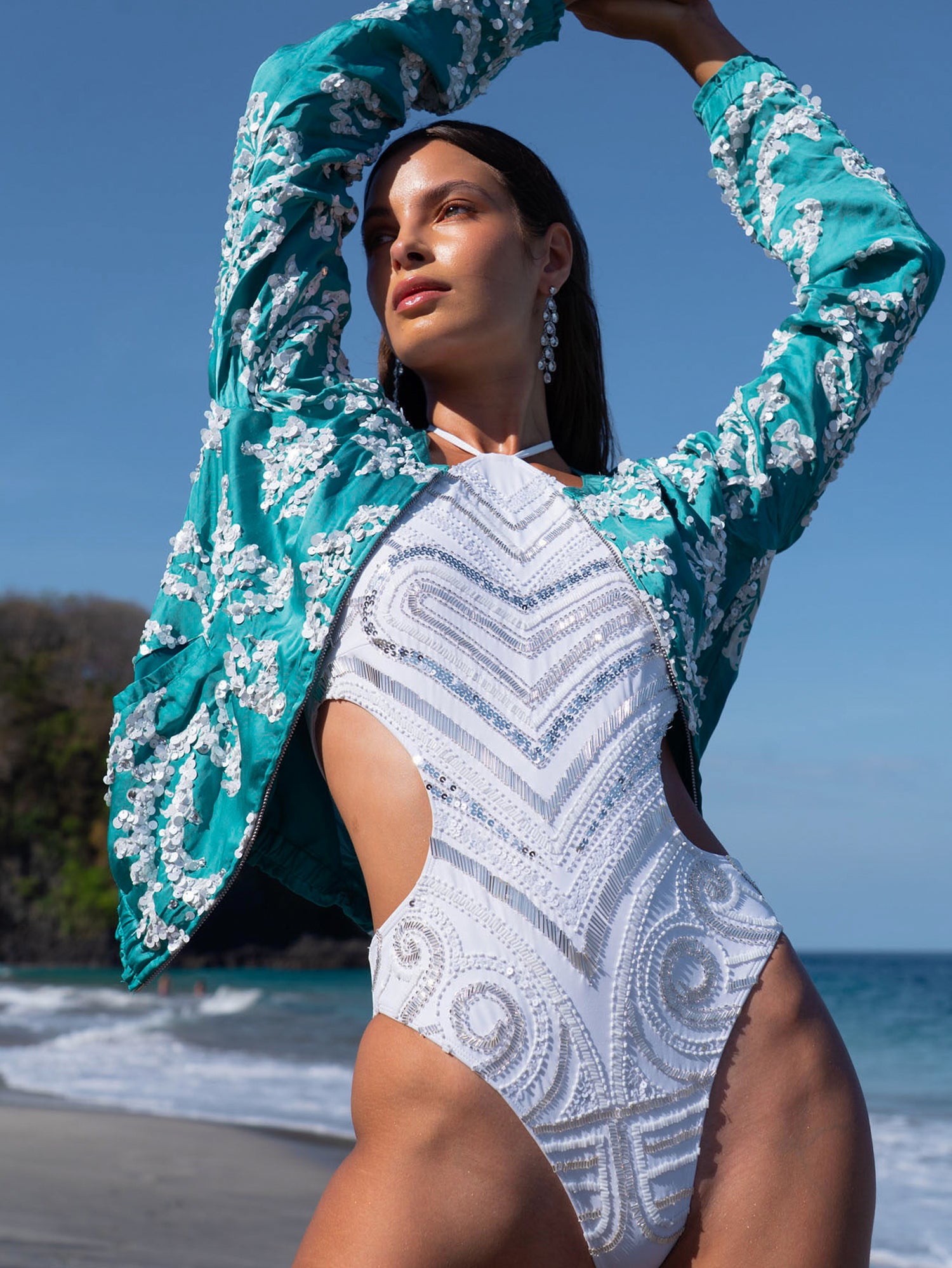 A trendy bomber jacket in emerald green satin , covered in a detailed hand beaded white sequin floral - lace pattern for a glamorous cover-up for your beach day or sunset cocktail bar.