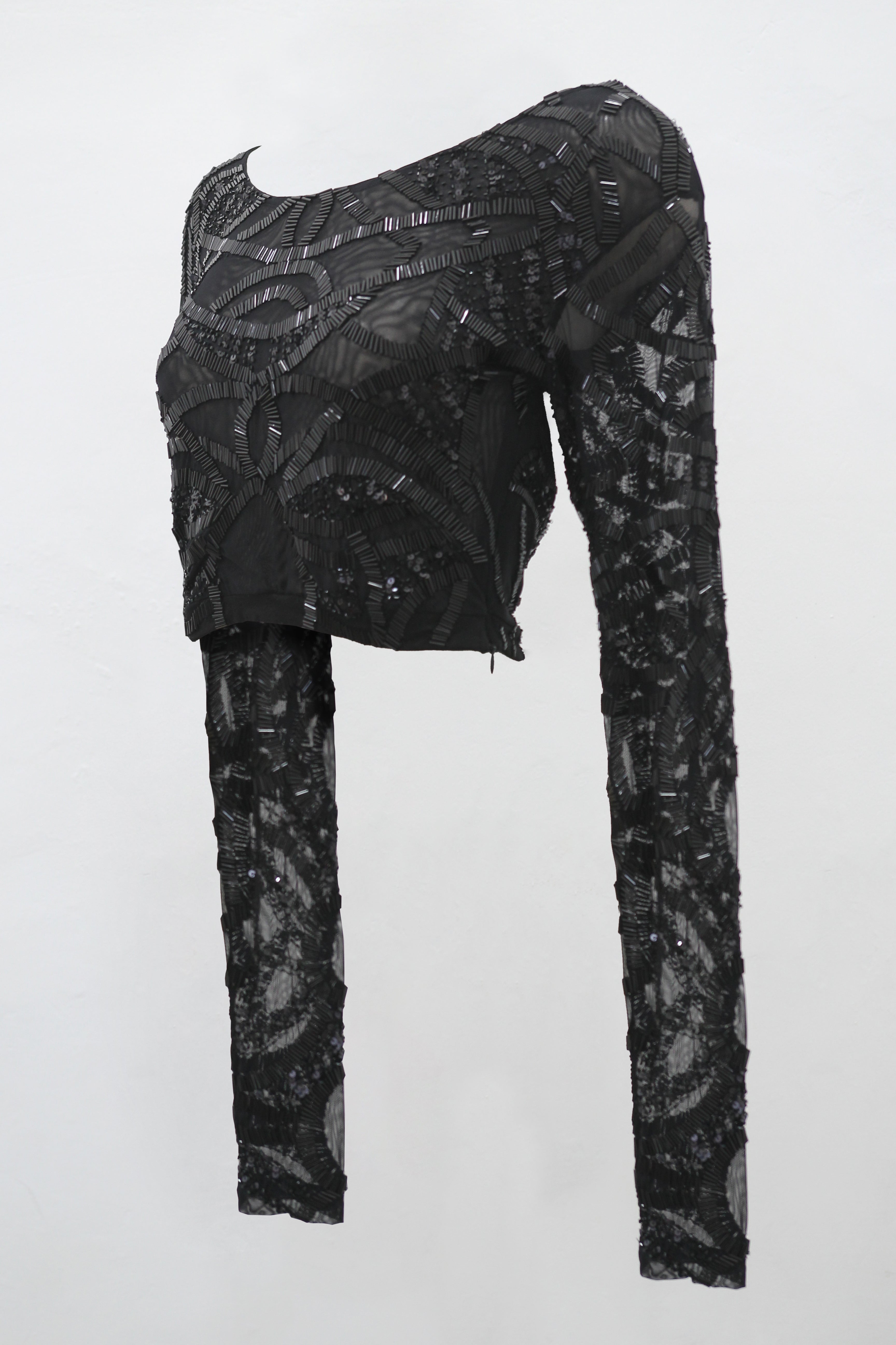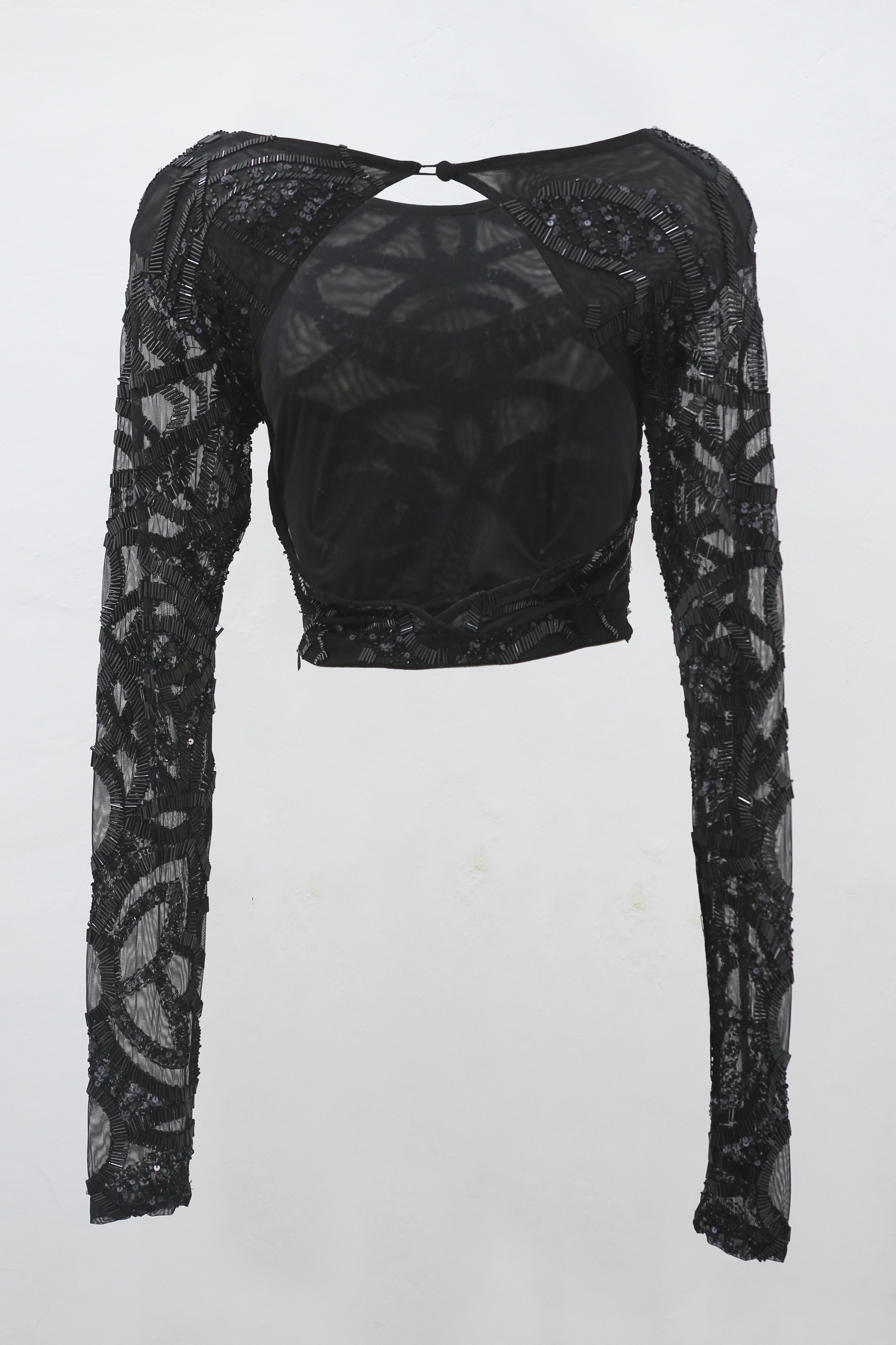 A long-sleeve crop top featuring a sheer material and a subtle, tonal black hand beaded sequin pattern.2