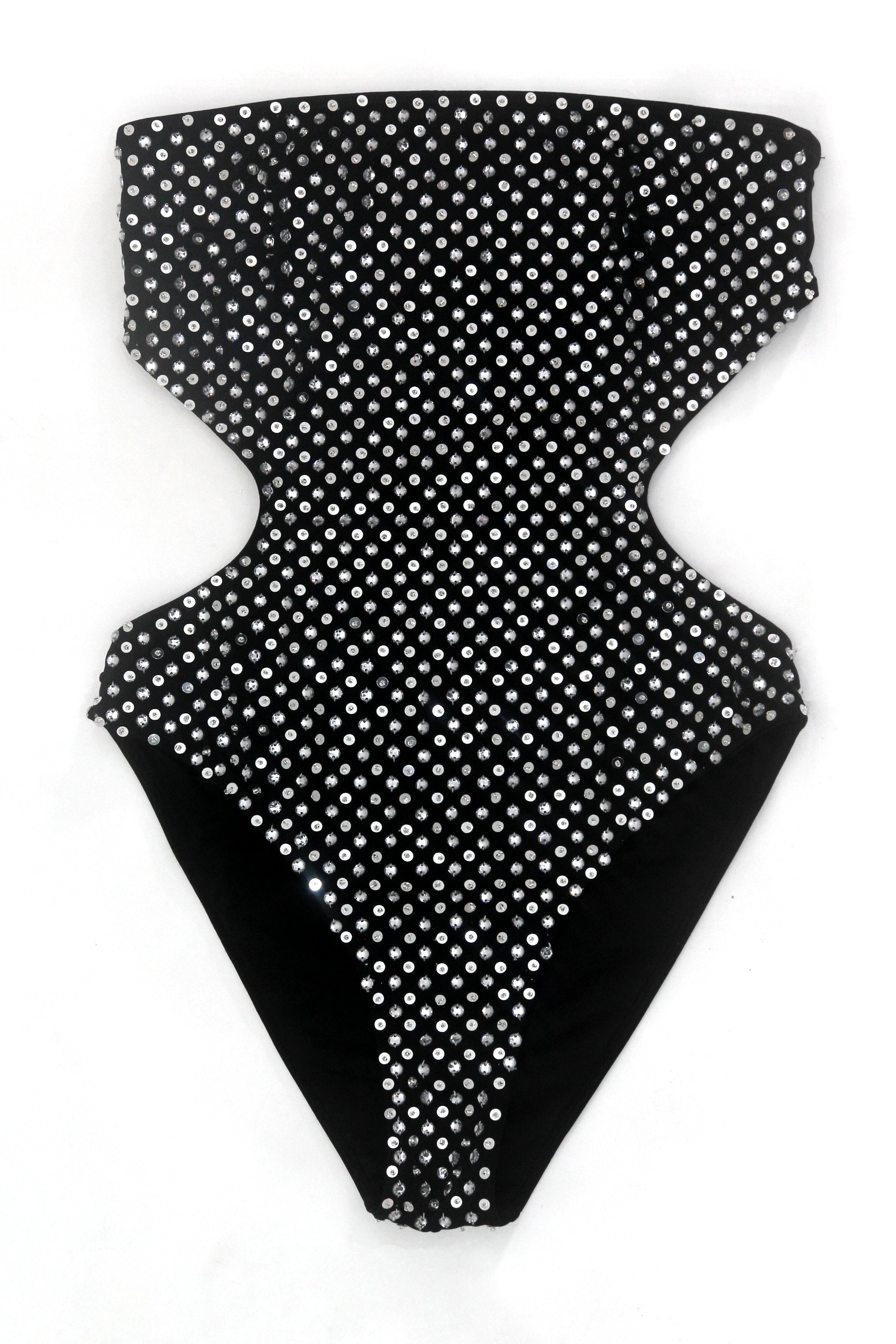 This black strapless one-piece, adorned with hand beaded crystals and sequins and seductive cutouts, is designed to steal the spotlight. Perfect for poolside glamour or a sunset soirée.