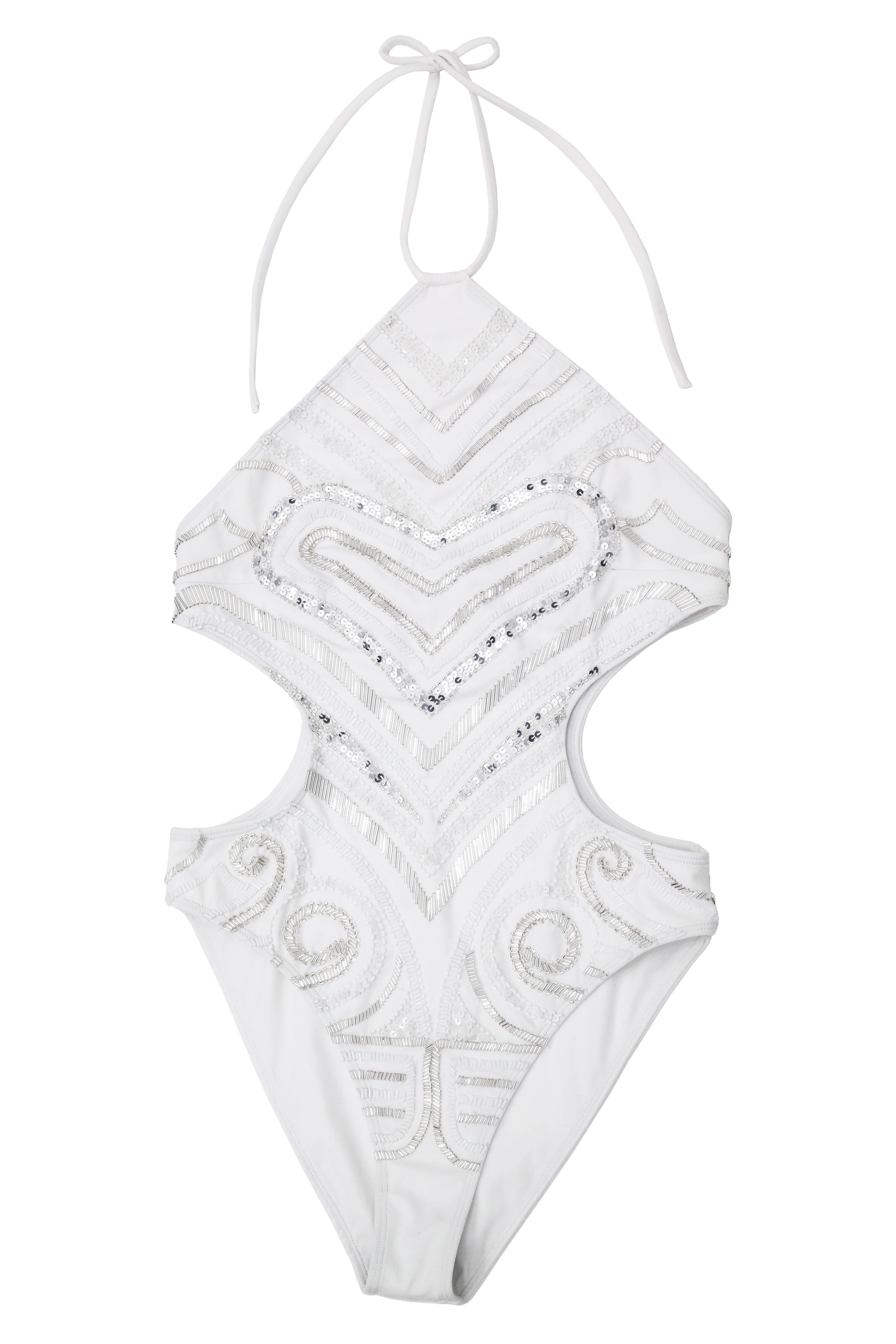 A luxurious white one-piece swimsuit with flattering side cut-outs. It is fully covered in an intricate silver beaded and sequin geometric and chevron pattern, perfect for a statement beach or pool look.