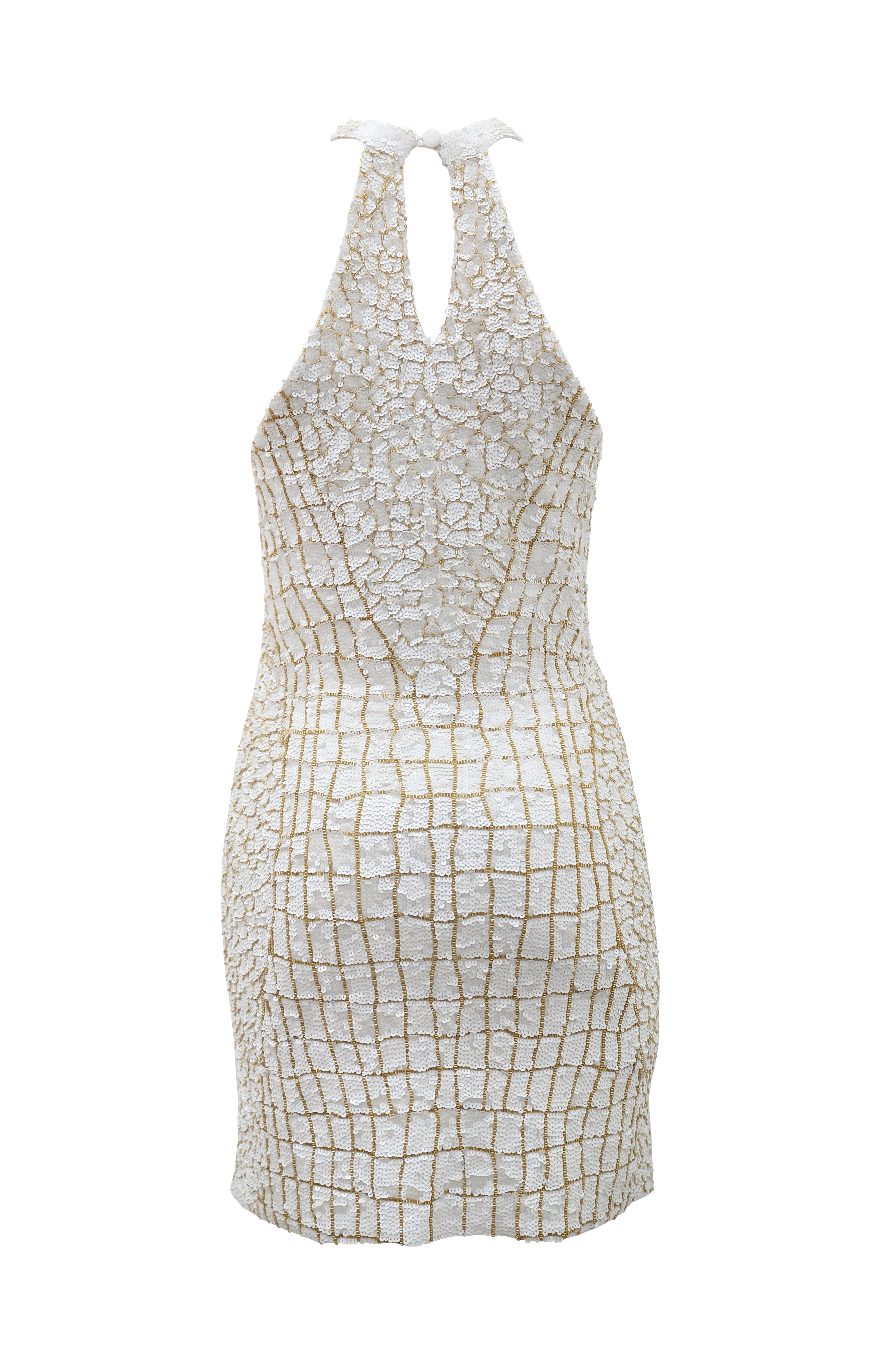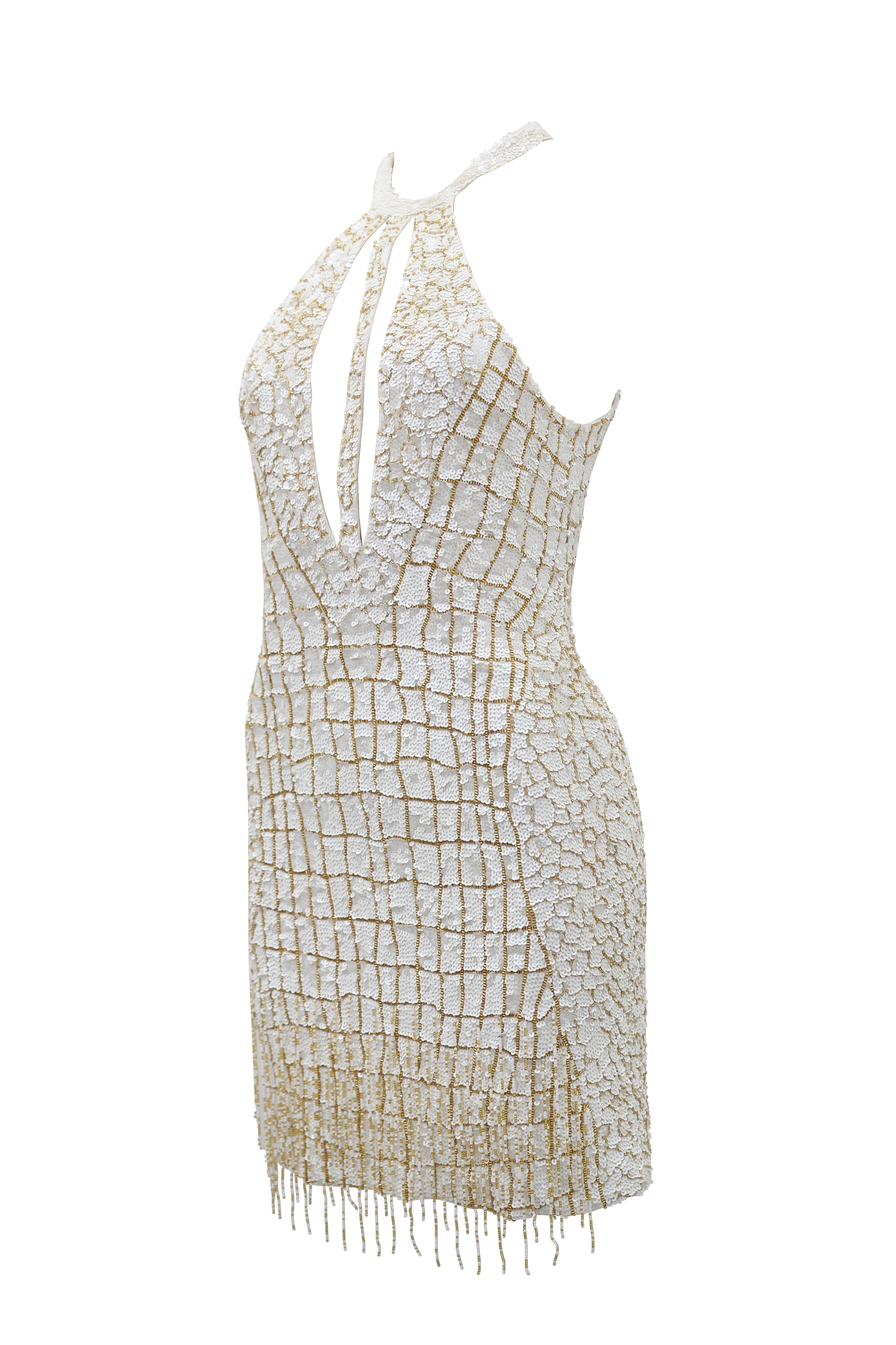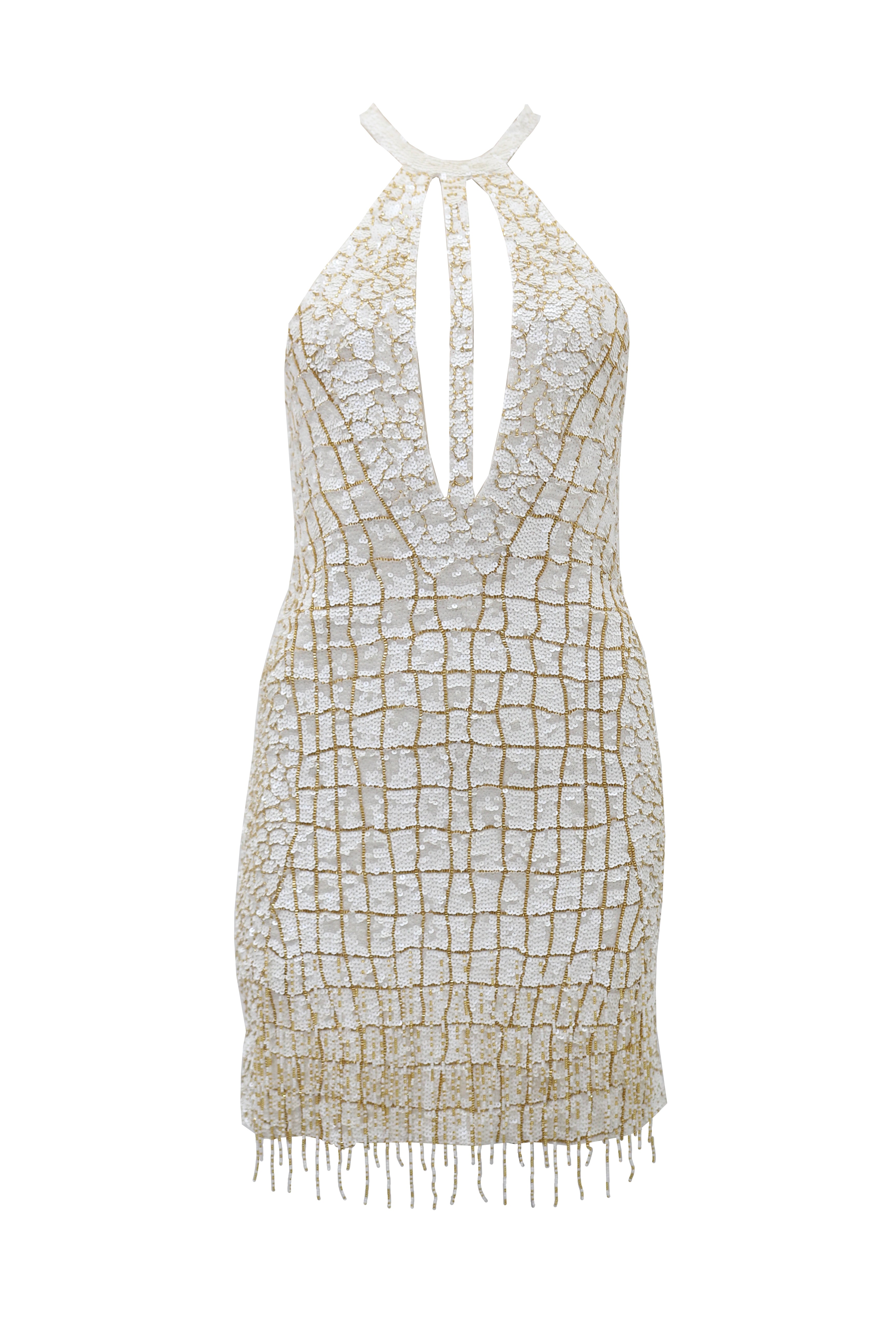 A chic halter-neck mini dress in white, featuring a sophisticated keyhole plunge neckline. The dress is intricately embellished with a entirely hand beaded gold grid pattern and finished with playful gold fringe at the hem.