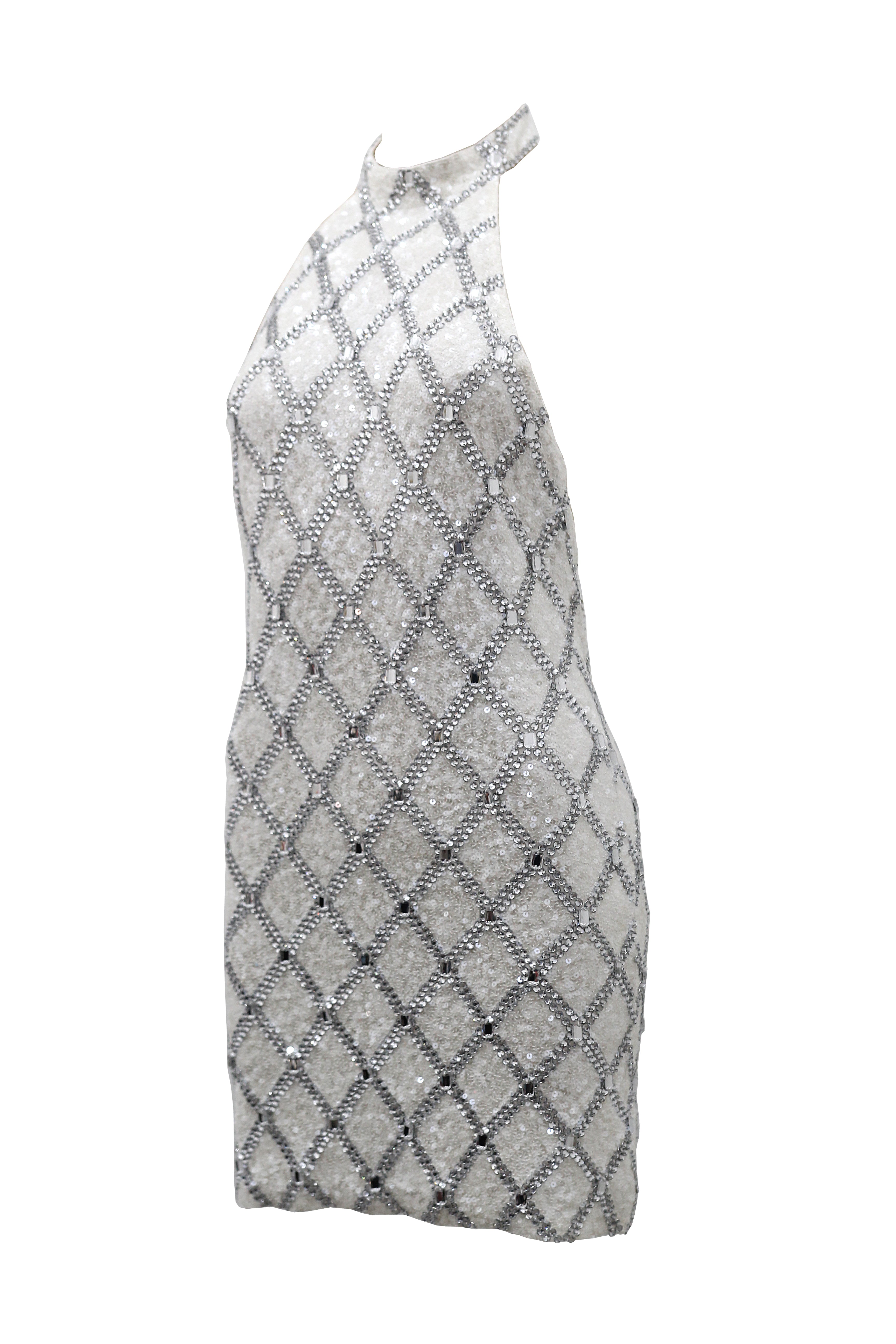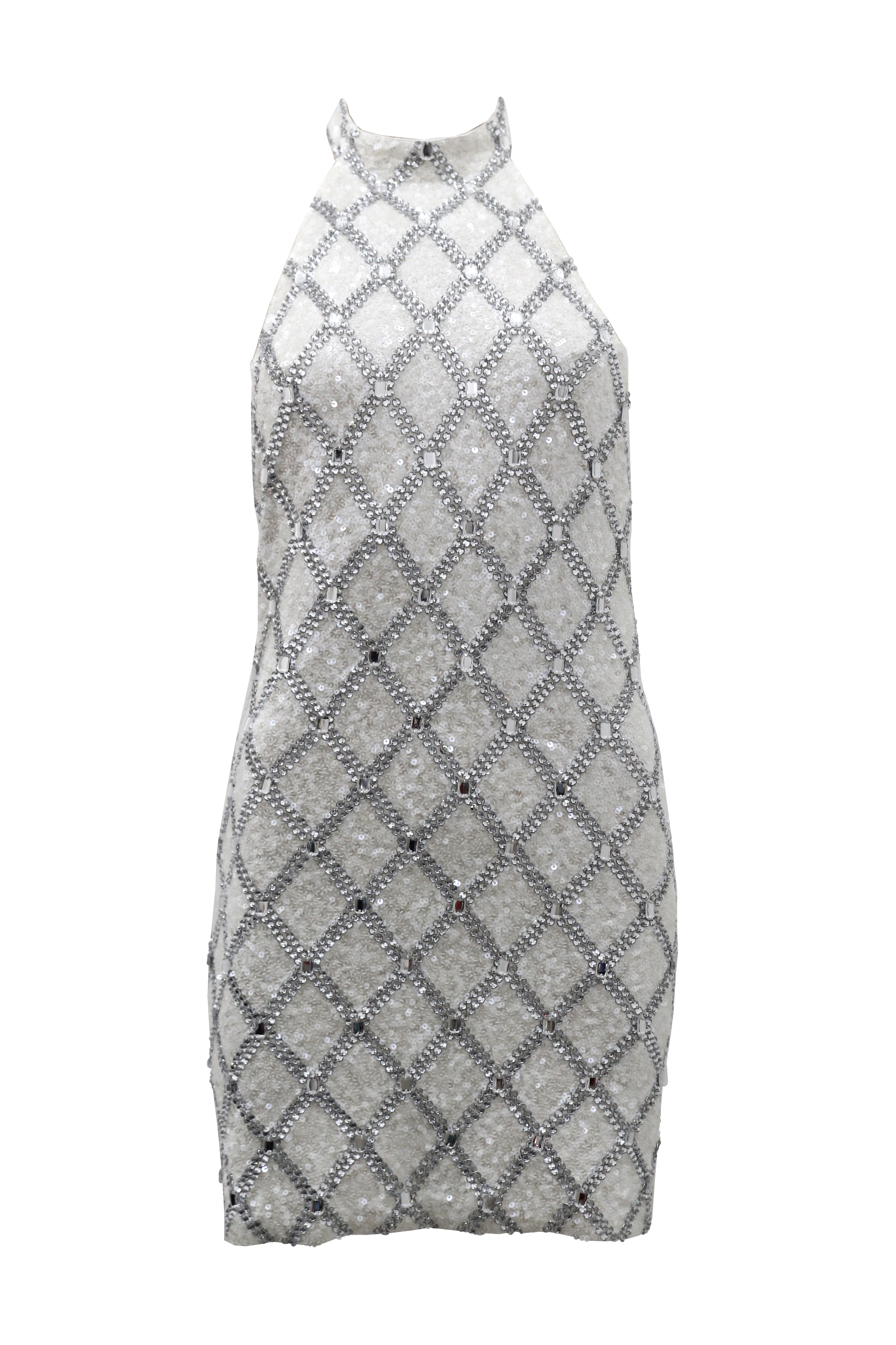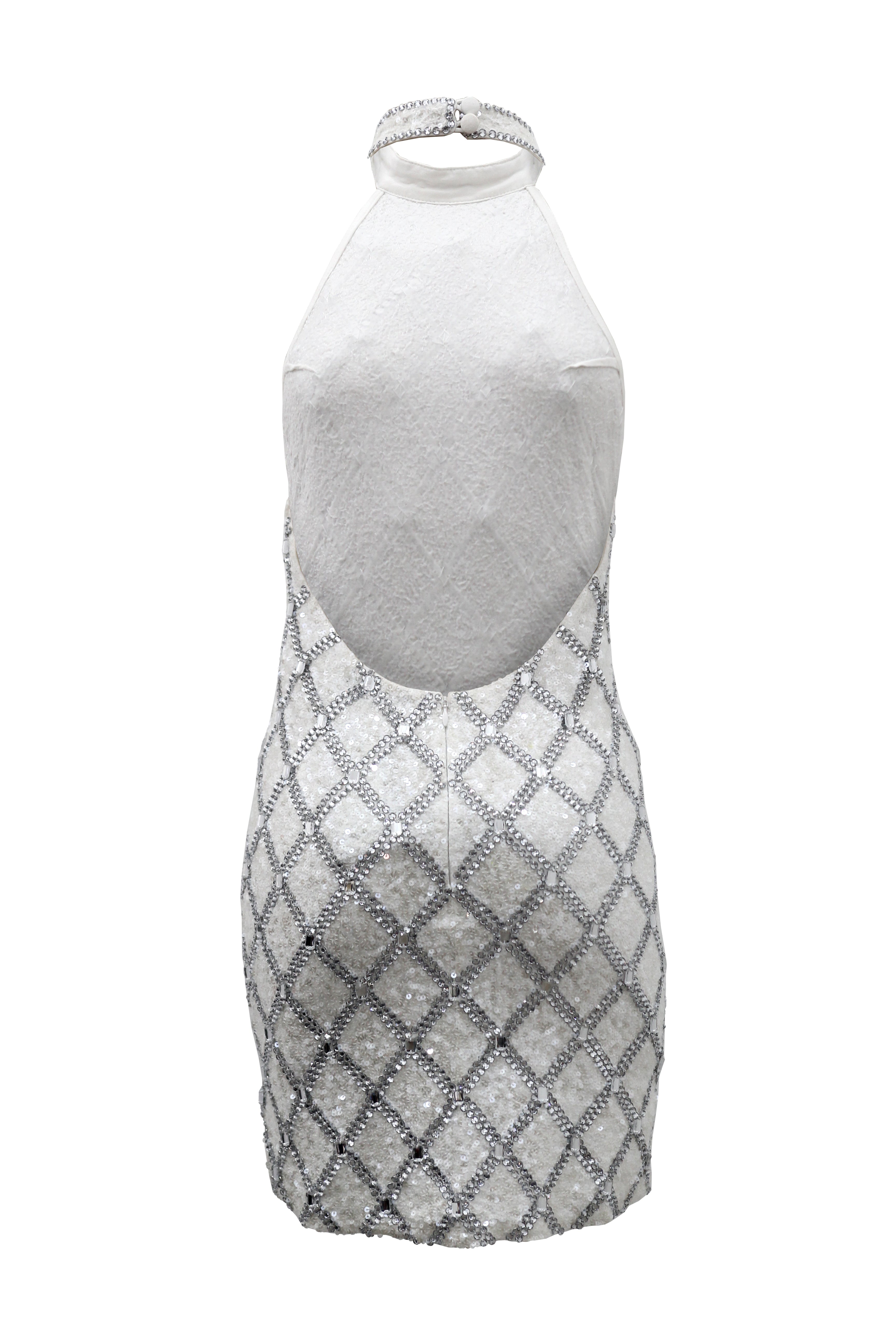 A glamorous high-neck mini dress in white, featuring a sophisticated silver beaded and sequin diamond-argyle pattern. This bodycon dress offers an elegant, all-over shimmer, entirely hand beaded with sequins and crystals
