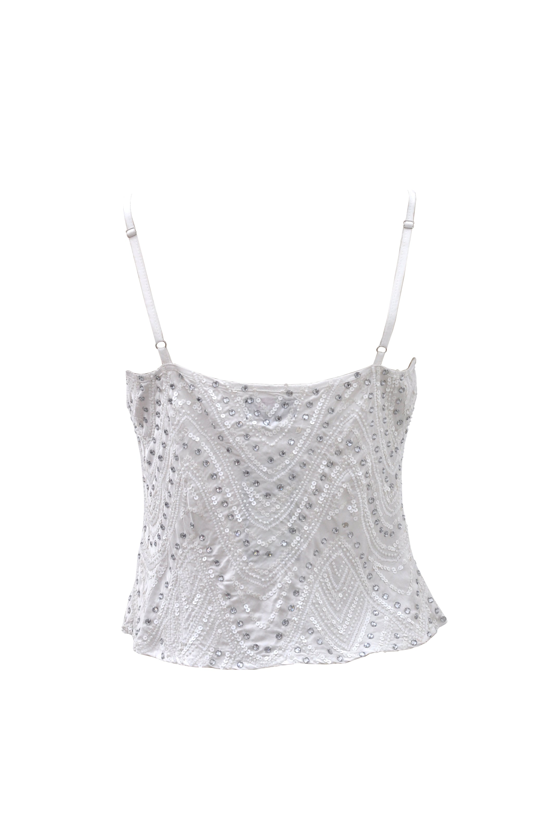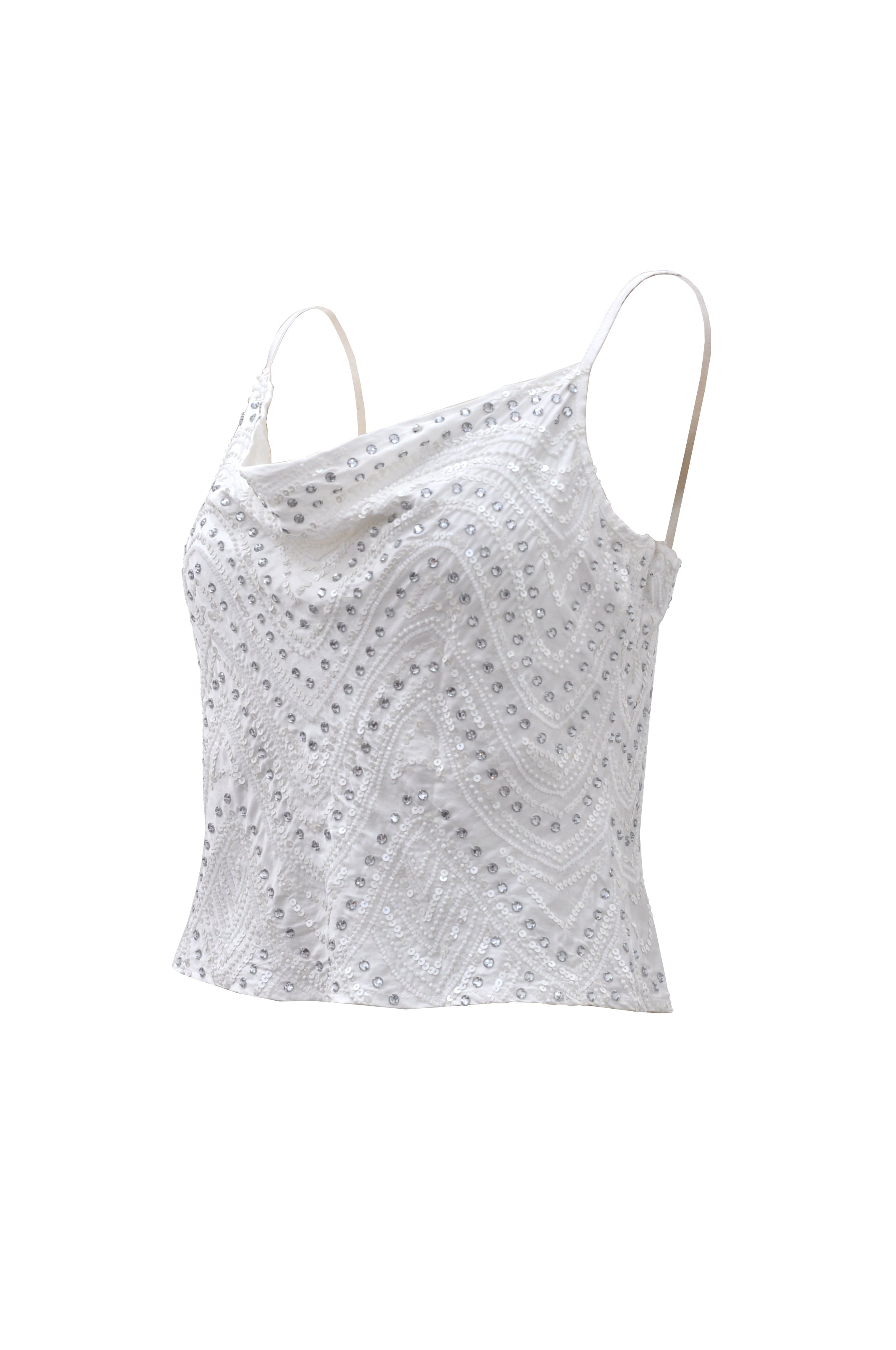 A stylish cowl-neck top in white, featuring an entirely hand beaded sequin chevron pattern for a elegant shimmer.